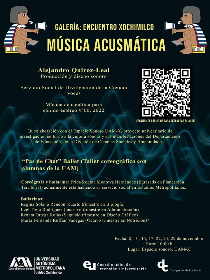 Colaboré desde la transdisciplina en la realización de diversas actividades culturales y científicas, exposiciones y en la creación y producción sonora de obras acusmáticas en el marco del 48 aniversario de la UAM, exponiendo en el Espacio Sonoro de la UAMX y en la Casa del Tiempo.